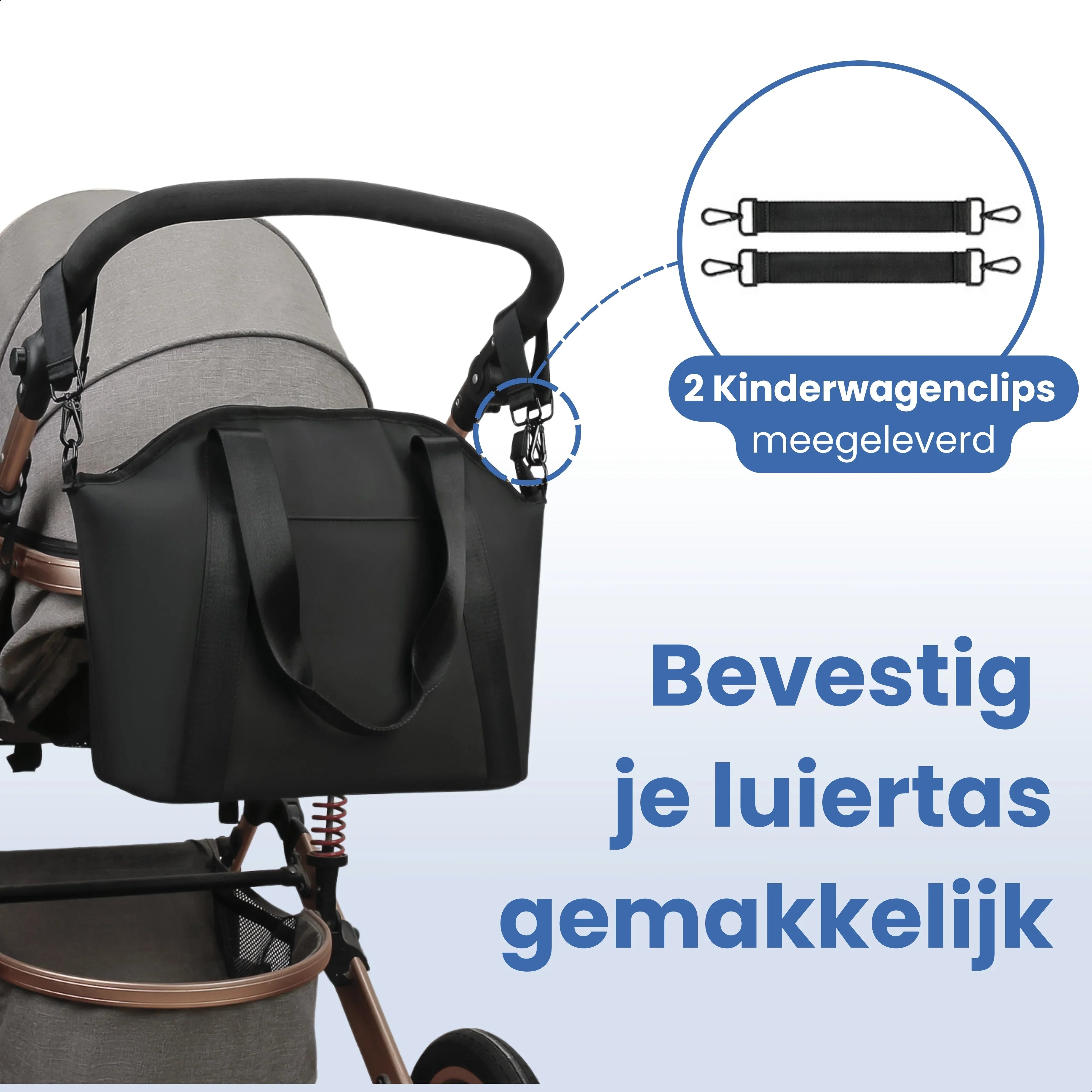 Ja, die Wickeltasche wird standardmäßig mit robusten Kinderwagenclips geliefert, sodass du sie einfach an jeden Kinderwagen befestigen kannst.