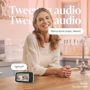 De babyfoon heeft een bereik tot 300 meter, afhankelijk van muren of obstakels. Ideaal voor gebruik in huis én in de tuin.