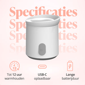 De flessenwarmer is draadloos en werkt ook onderweg. Laad hem de eerste keren volledig op voor het beste resultaat.