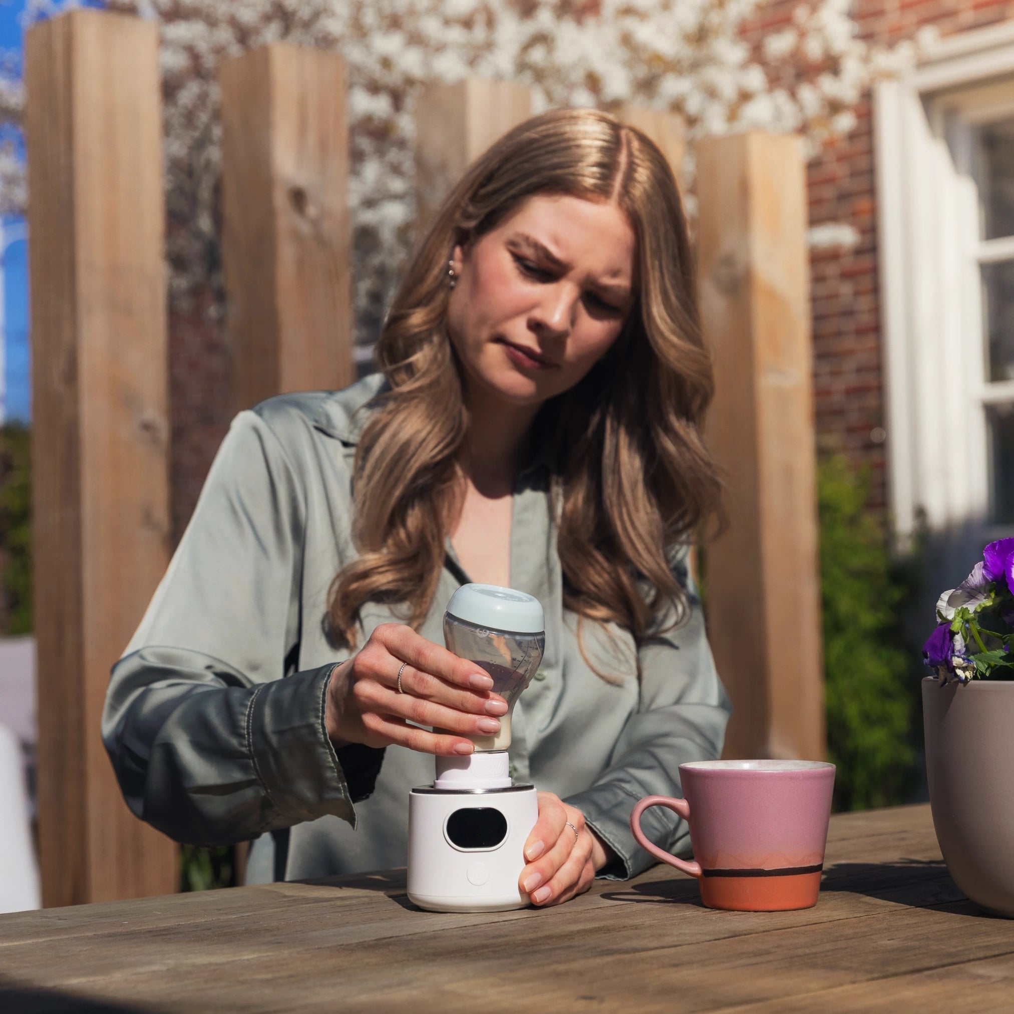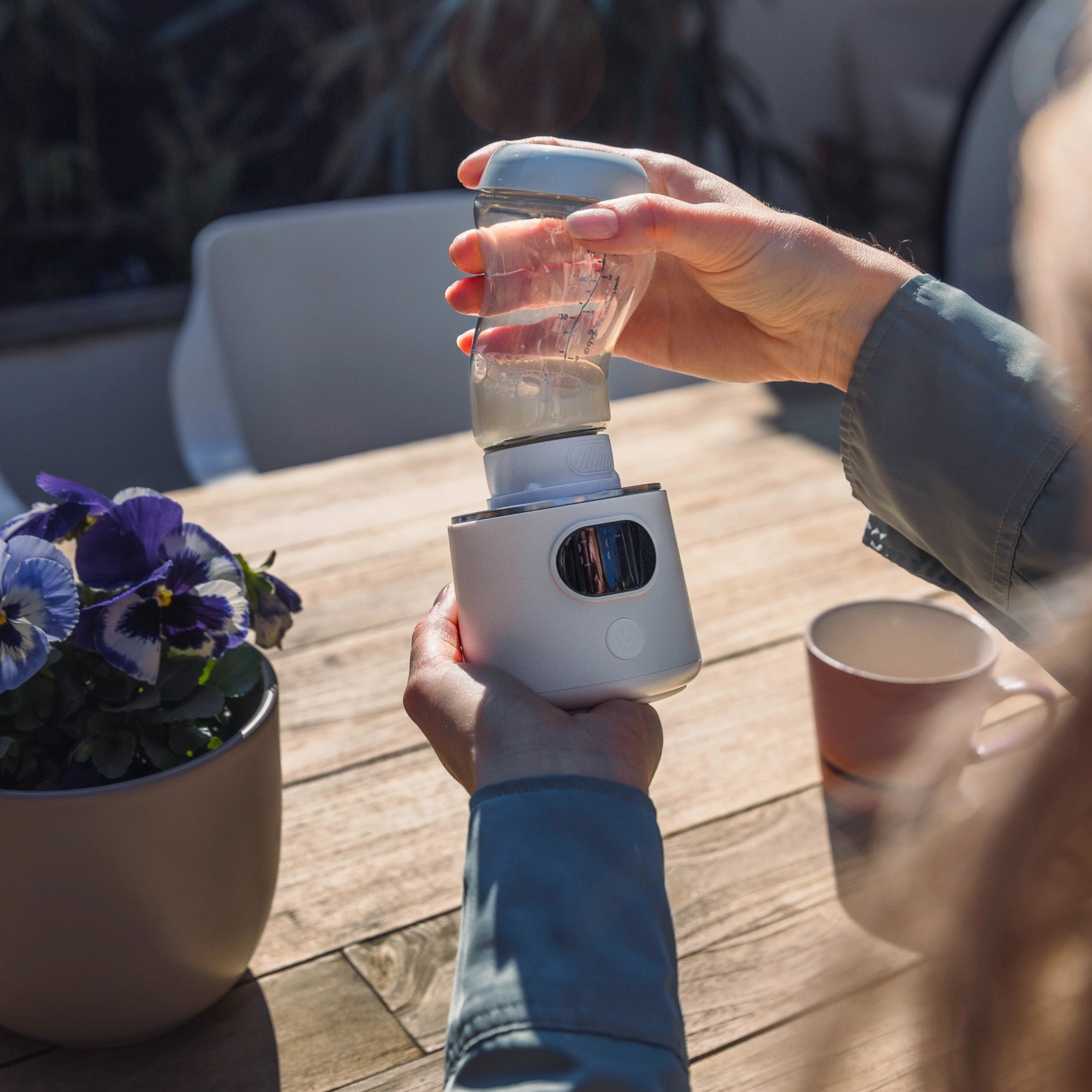 De flessenwarmer is draadloos en werkt ook onderweg. Laad hem de eerste keren volledig op voor het beste resultaat.