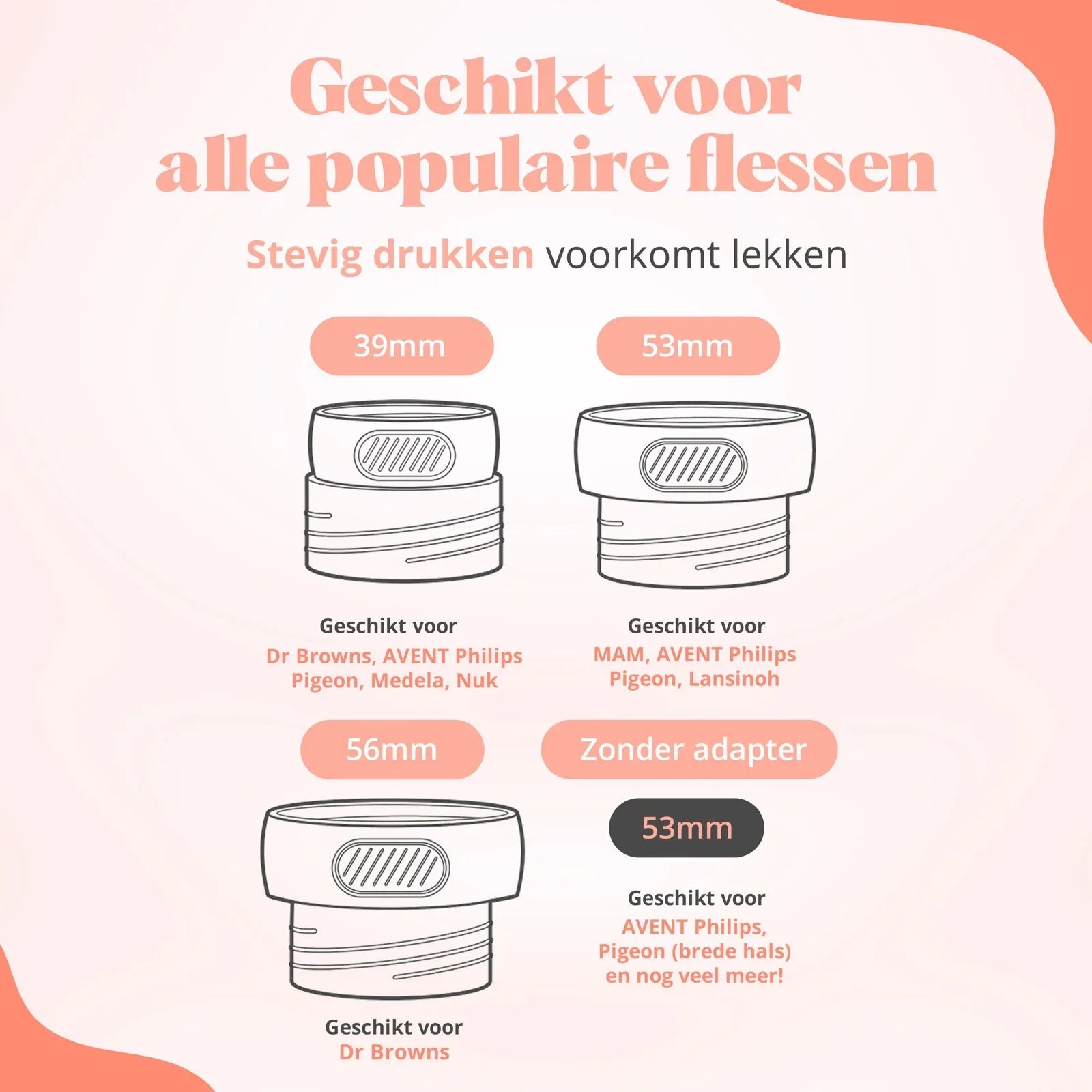 Adapters: Geschikt voor de meeste flessen dankzij 3 meegeleverde adapters (39 mm, 53 mm, 56 mm)